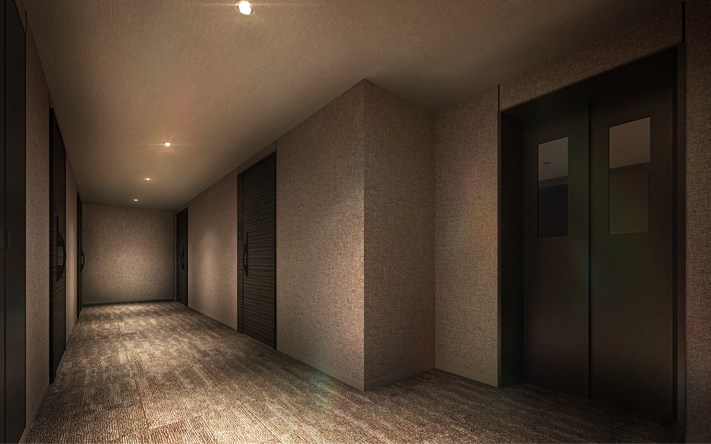 ホテルのような高級感を演出し、雨に濡れない快適さを備えた内廊下。プライバシーとセキュリティが重視された空間は、柔らかく温かみのある照明によってリラックスできる雰囲気に包まれます。